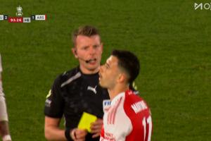 體育資訊04月05日訊 阿森納vs圣徒第93分鐘,道曼推進時倒地,阿森納定位球,馬丁內(nèi)利著急了隨即推了裁判一下,這下馬丁內(nèi)利染黃!