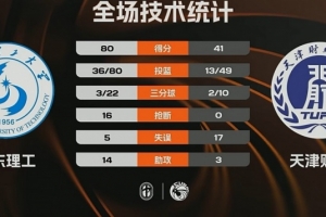 第四節(jié),王虹延續(xù)火力,天津財大不斷沖擊內線苦苦支撐,王虹和邢欣相繼三分穿針,馬芮瑩反擊將分差拉開到40分以上,朱明慧內線得手,最終,山東理工80-41大勝天津財大。