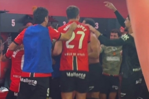賽后馬略卡球員在更衣室內激情慶祝,更衣室的桌子上擺滿了美食。