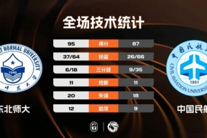 末節(jié)比賽,中國(guó)民航先拿5分縮小分差,東北師大及時(shí)調(diào)整給出回應(yīng),僵持半節(jié)之后中國(guó)民航的外線突然投開,連續(xù)命中三分球后分差僅剩3分,關(guān)鍵時(shí)刻閆思愷也是強(qiáng)投三分命中幾乎殺死了中國(guó)民航逆轉(zhuǎn)的希望,最終東北師大力克中國(guó)民航成功晉級(jí)。