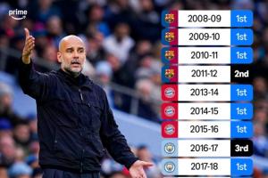 據(jù)轉(zhuǎn)播商亞馬遜統(tǒng)計,瓜迪奧拉執(zhí)教生涯至今從未連續(xù)兩個賽季無緣聯(lián)賽冠軍。