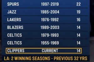 快船在隊史的前32個賽季,只有2個賽季是勝率超5成的