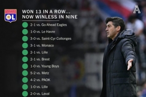 據(jù)TA統(tǒng)計(jì),豐塞卡麾下的里昂此前取得13連勝,而2月中旬之后,里昂已經(jīng)連續(xù)9場比賽不勝,戰(zhàn)績4平5負(fù)。