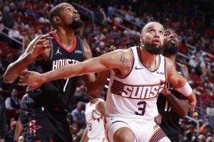 目前,火箭49勝29負(fù)西部第五,太陽(yáng)43勝35負(fù)西部第七。