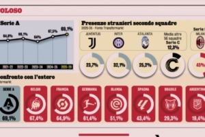 意甲聯(lián)賽外籍球員比例從2017-2018賽季的55.2%升至本賽季的69.1%,主流聯(lián)賽中外籍球員比例僅低于英超(75.4%)、葡超(73.8%)。