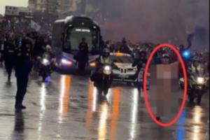 據(jù)TA記者Guillermo Rai在現(xiàn)場的拍攝,皇馬大巴在球迷的簇?fù)碇星巴{烏球場,而大巴前還跑過一名裸男。