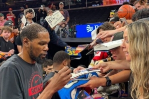 在賽前訓(xùn)練結(jié)束后,杜蘭特為菲尼克斯的球迷們簽名。