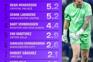 以下為本賽季英超門(mén)將阻止進(jìn)球榜top10: