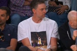 湖人名宿大加索爾來到現(xiàn)場觀戰(zhàn),身上穿著一件印有科比81分慶祝動(dòng)作的T恤。