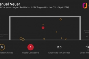 拜仁門將諾伊爾本場比賽做出9次撲救,他是有相關統(tǒng)計以來,首位在客戰(zhàn)皇馬的歐冠淘汰賽中做出9次撲救的門將。