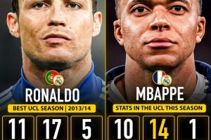 姆巴佩本賽季歐冠出戰(zhàn)10場比賽已經(jīng)打進14球,高居射手榜第一。而在歐冠單賽季總進球排行榜上,姆巴佩距離C羅在2013/14賽季的17球紀錄還有3球之差。