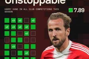 據(jù)Sofascore統(tǒng)計,凱恩本賽季為拜仁出戰(zhàn)41場比賽,打進49球,僅10場比賽未破門,從未連續(xù)3場比賽無進球。