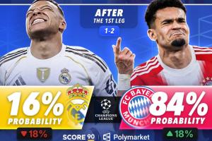 本場賽前,皇馬晉級歐冠四強的概率為34%,拜仁為66%;首回合比賽結(jié)束后,皇馬的晉級概率被下調(diào)至16%,拜仁則上升至84%。