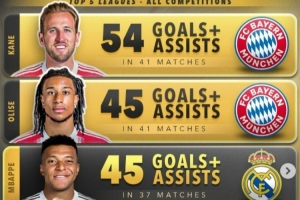 體育資訊4月8日訊 數(shù)據(jù)網(wǎng)站Score90盤點了本賽季五大聯(lián)賽球員在各項賽事總參與進球榜(進球+助攻),前五中拜仁占據(jù)三席,具體如下: