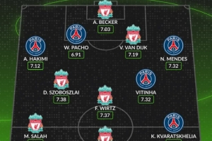 體育資訊4月8日訊 歐冠淘汰賽巴黎對陣利物浦的比賽即將打響,數(shù)據(jù)網(wǎng)站W(wǎng)hoscored也盤點了兩隊球員在本賽季歐冠場均評分最高陣容(至少出場500分鐘),具體如下: