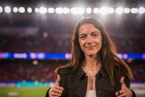 體育資訊4月9日訊 歐冠1/4決賽首回合,巴薩在諾坎普迎戰(zhàn)馬競。本場比賽,巴薩女足球星邦馬蒂出現(xiàn)在現(xiàn)場為紅藍軍團加油助威。