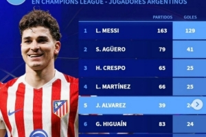 體育資訊4月9日訊 在歐冠淘汰賽首回合馬競(jìng)2-0擊敗巴薩的比賽中,阿爾瓦雷斯破門。以下為歐冠歷史阿根廷球員射手榜: