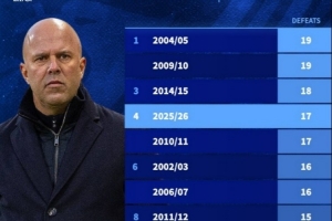 體育資訊4月9日訊 在歐冠淘汰賽首回合,利物浦0-2不敵巴黎。這是利物浦本賽季各項賽事第17場失利,以下為利物浦本世紀單賽季輸球場次榜: