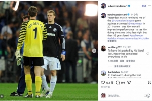 傳奇門將范德薩社媒曬出昔日與諾伊爾交手的合照,配文:“昨天的比賽讓我想起了2011年在歐冠賽場對陣才華橫溢的諾伊爾,當時我自己也40歲了!昨晚看到他奉獻與當年同樣出色的表現(xiàn),但時間已經(jīng)過去了15年,真是令人印象深刻!”