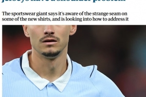 耐克在給《衛(wèi)報》的一份聲明中承認了球衣肩部設計問題,并表示正在研究可能的解決方案:“在最近的國際比賽期間,我們注意到我們的國家隊球衣在肩縫處存在一個小問題。雖然不影響球衣性能,但整體外觀沒有達到應有的標準。”