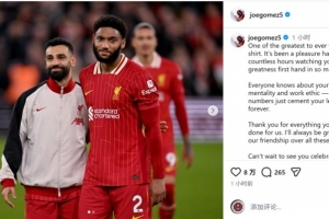 喬·戈麥斯社媒曬出與薩拉赫的合照,并寫(xiě)道:“你是身穿這件球衣的最偉大球員之一。能有無(wú)數(shù)小時(shí)親眼見(jiàn)證你在方方面面的卓越表現(xiàn),這是我的榮幸。”