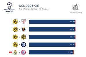 本賽季歐冠上座人數(shù)前十: