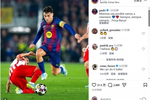 巴薩中場佩德里社媒曬出比賽照片,配文:“只要還有可能,我們就會努力嘗試。永遠(yuǎn)、永遠(yuǎn)、永遠(yuǎn),加油巴薩!”