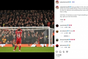 羅伯遜曬出自己向安菲爾德的謝場照,并表示:“告別這家俱樂部和球迷們將是我人生中最艱難的決定之一。但此后將會有那么一個時刻,讓我好好回顧并感受一切——那就是五月份?!?/p>