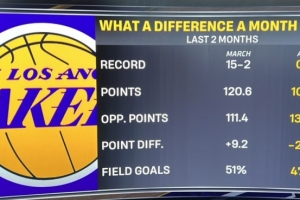三月湖人的戰(zhàn)績是15勝2負,場均得到120.6分,失分111.4,凈勝分+9.2,命中率51%;