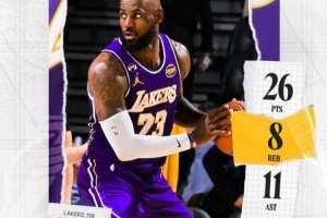 賽后,湖人官方發(fā)布詹姆斯本場26+8+11數(shù)據(jù)海報。