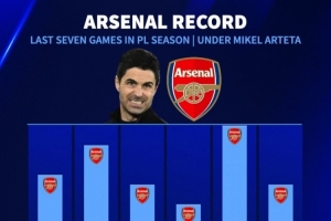 體育資訊4月11日訊 阿森納本賽季英超31輪比賽積70分,位居積分榜首位,領(lǐng)先少賽一場的第二名曼城9分,德國轉(zhuǎn)會(huì)市場盤點(diǎn)了阿爾特塔執(zhí)教阿森納賽季最后7輪拿到的積分。