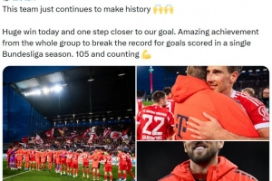 他也在賽后通過社媒曬出比賽照,并慶祝勝利:“這支球隊仍在創(chuàng)造歷史????今天取得重大勝利,離我們的目標又近了一步。全隊共同努力取得非凡成就,打破了德甲單賽季進球紀錄。目前已經(jīng)105球了,而且還在繼續(xù)增加!”