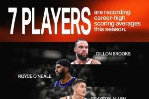 球隊(duì)配文寫道:“全員進(jìn)化!這就是奧特體系的魔力 ??? 本賽季,太陽(yáng)隊(duì)共有 7位球員 創(chuàng)下職業(yè)生涯場(chǎng)均得分新高!”