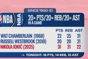 2025年約基奇曾轟下31分21籃板22助攻,本場(chǎng)目前約基奇已砍下18分14籃板15助攻)