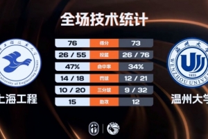 易邊再戰(zhàn),上海工程發(fā)起追分,他們利用一波8-2的小高潮迅速完成反超,不過溫州大學(xué)連拿9分立馬給出回應(yīng),之后的比賽上海工程雖然緊咬比分沒能再獲得反超的機(jī)會,三節(jié)結(jié)束,溫州大學(xué)52-50領(lǐng)先上海工程。