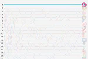 數(shù)據(jù)機(jī)構(gòu)Football Meets Data曬出了本賽季德甲排名的走勢圖,拜仁從首輪6-0萊比錫開始,一直穩(wěn)坐榜首。相比之下其余17支的球隊的排名則不斷上下變動。