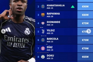 德轉(zhuǎn)左邊鋒身價(jià)榜:維尼修斯1.5億歐居首,K77以9000萬(wàn)歐位居次席