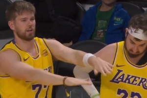 比賽中鏡頭給到場(chǎng)邊,兩名球迷形似東契奇和蒂米,山寨版東契奇翩翩起舞,非常忘我。