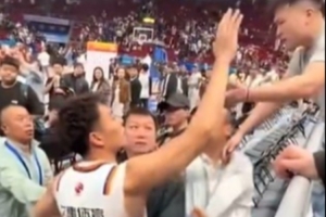 比賽結(jié)束后,場(chǎng)邊發(fā)生了一個(gè)小插曲,上海男籃球員李添榮想和場(chǎng)邊的球迷擊掌互動(dòng),但是遭到北京主場(chǎng)工作人員的攔截。