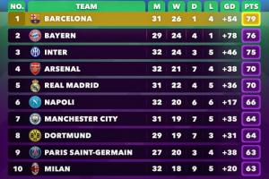 體育資訊04月13日訊 歐洲五大聯賽已經進入最后沖刺階段,Score90統計了五大聯賽合并的積分榜,表格從左至右分別為比賽場數、勝、平、負、凈勝球以及積分。巴薩以79分位居第一,拜仁第二,國米第三,阿森納第四。