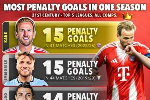 本世紀(jì)單賽季點(diǎn)球進(jìn)球榜:凱恩41場(chǎng)15球居首,C羅、梅西14球次之