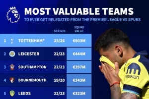 熱刺與降級(jí)球隊(duì)身價(jià)排名:
