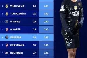 體育資訊4月14日訊 德國轉(zhuǎn)會市場統(tǒng)計了上賽季以來五大聯(lián)賽球員出場次數(shù)情況,巴爾韋德以109場居首,維尼修斯104場、瓊阿梅尼102場分列二三位,前三均為皇馬球員。
