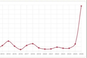 這張折線(xiàn)圖展示了在2010年至2026年間,關(guān)鍵詞“擺爛”在每1000條謠言中的提及次數(shù)的變化趨勢(shì)。