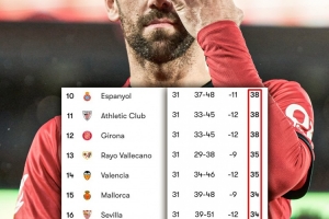 在西甲積分榜上,位居第10的西班牙人拿到38分,而位居第18 的埃爾切則拿到32分,也就是說第10和第18僅有6分的差距。因此,從第10到第18都有降級的可能性。