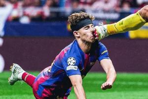 體育資訊04月15日訊 歐冠1/4決賽次回合,馬競(jìng)vs巴薩,第26分鐘,費(fèi)爾明頭球攻門,隨后被穆索踢到頭部,倒地撞向地面,當(dāng)場(chǎng)血崩!