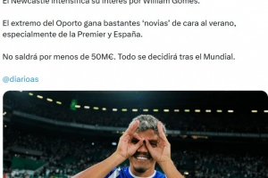 報(bào)道稱這位波爾圖邊鋒在夏季轉(zhuǎn)會(huì)窗口前吸引了眾多追求者,尤其是來自英超和西班牙的俱樂部。預(yù)計(jì)他的轉(zhuǎn)會(huì)費(fèi)不會(huì)低于5000萬(wàn)歐元。一切將在世界杯后決定。