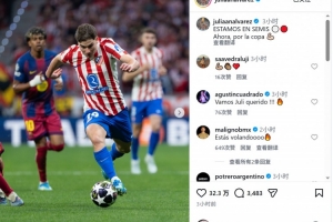 阿爾瓦雷斯社媒曬出比賽照片,慶祝球隊晉級,配文:“我們晉級歐冠半決賽,現(xiàn)在要沖擊國王杯冠軍!”