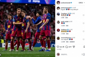 巴薩傳奇中場伊涅斯塔社媒曬出球員們的賽場合照,鼓勵后輩,配文:“驕傲,加油巴薩!”