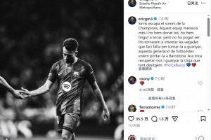 埃里克·加西亞社媒寫道:“歐冠夢想與我們擦肩而過,這支球隊值得擁有更多,我們已經(jīng)拼盡全力,一度觸手可及,但最終未能如愿?!?/p>
